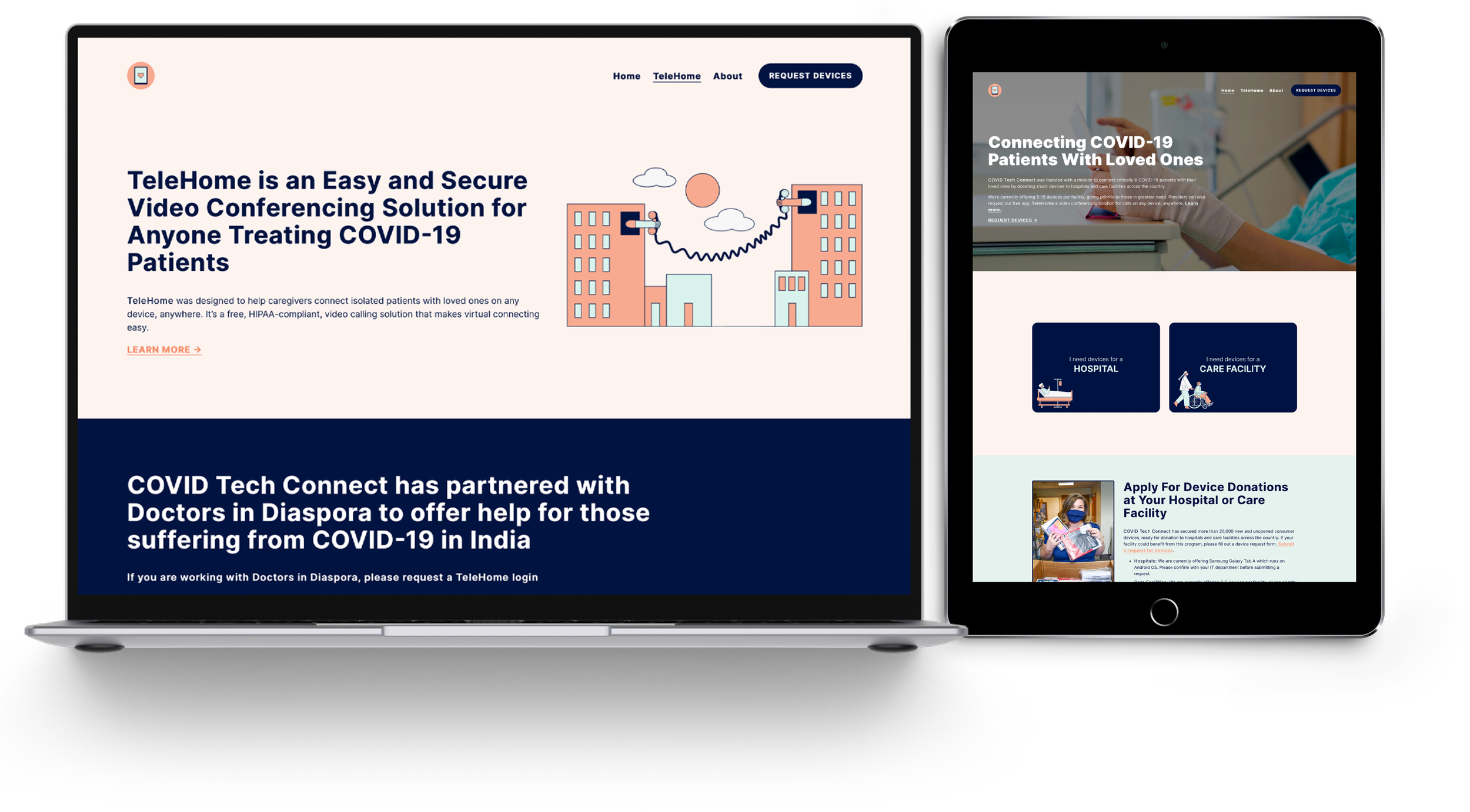 About one year after its original debut, COVID Tech Connect expanded into software with an app called TeleHome. TeleHome, which soft launched in May 2021, is a device-agnostic, HIPAA-compliant way to perform a video call within a hospital.